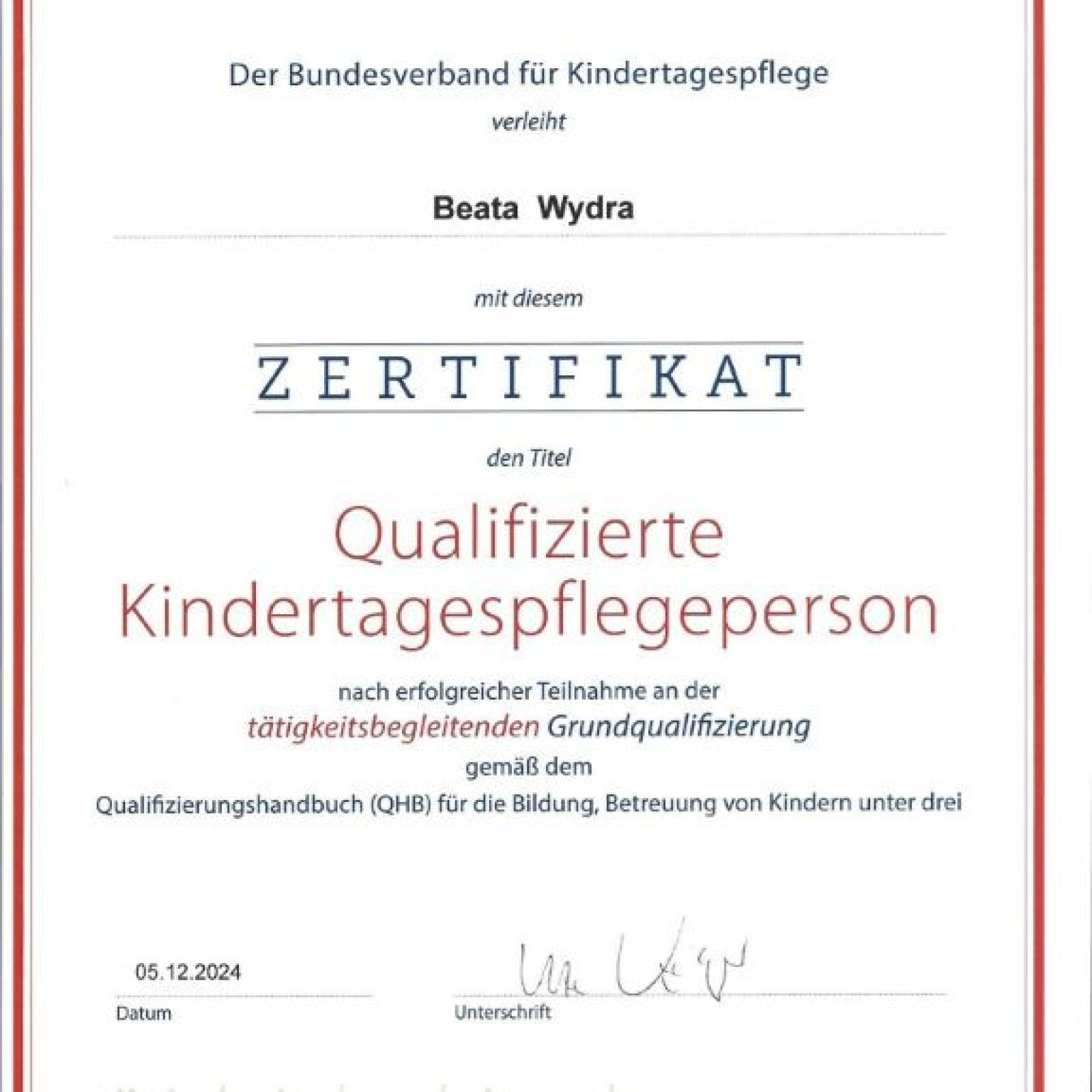 In der Kindertagespflege ist die pädagogische Qualifizierung der Betreuungsperson Grundvoraussetzung. Vom Jugendamt habe ich die Pflegeerlaubnis 2018 erhalten. Seit dieser Zeit besuche ich mehrmals jährlich Fortbildungen, die mein Wissen in verschiedenen Bereichen der Kinderbetreuung immer wieder erweitern. Dazu zählen Erste-Hilfe-Kurse, Kurse über kindgerechte Ernährung oder auch Kurse zu neuen Mal- und Bastelideen mit den Kindern. So wird es bei uns nie langweilig und wir haben viel Spaß miteinander.